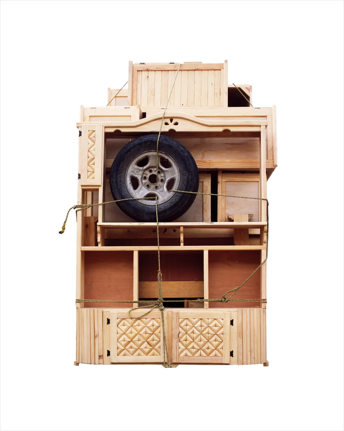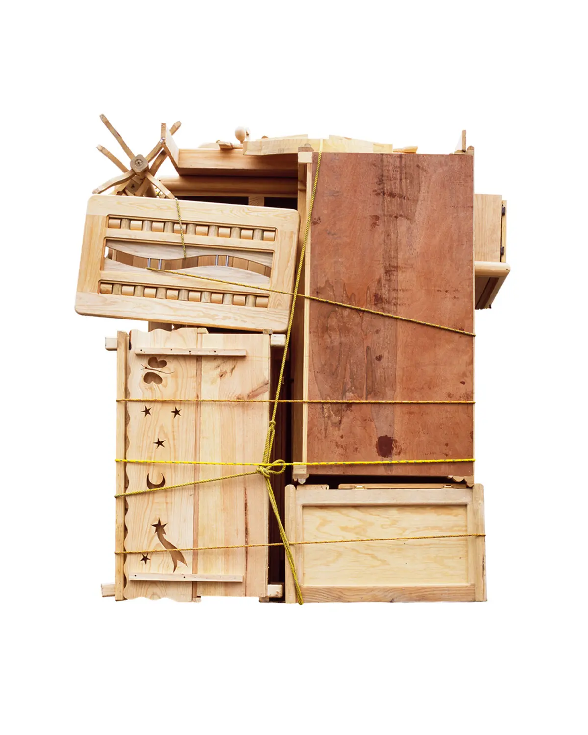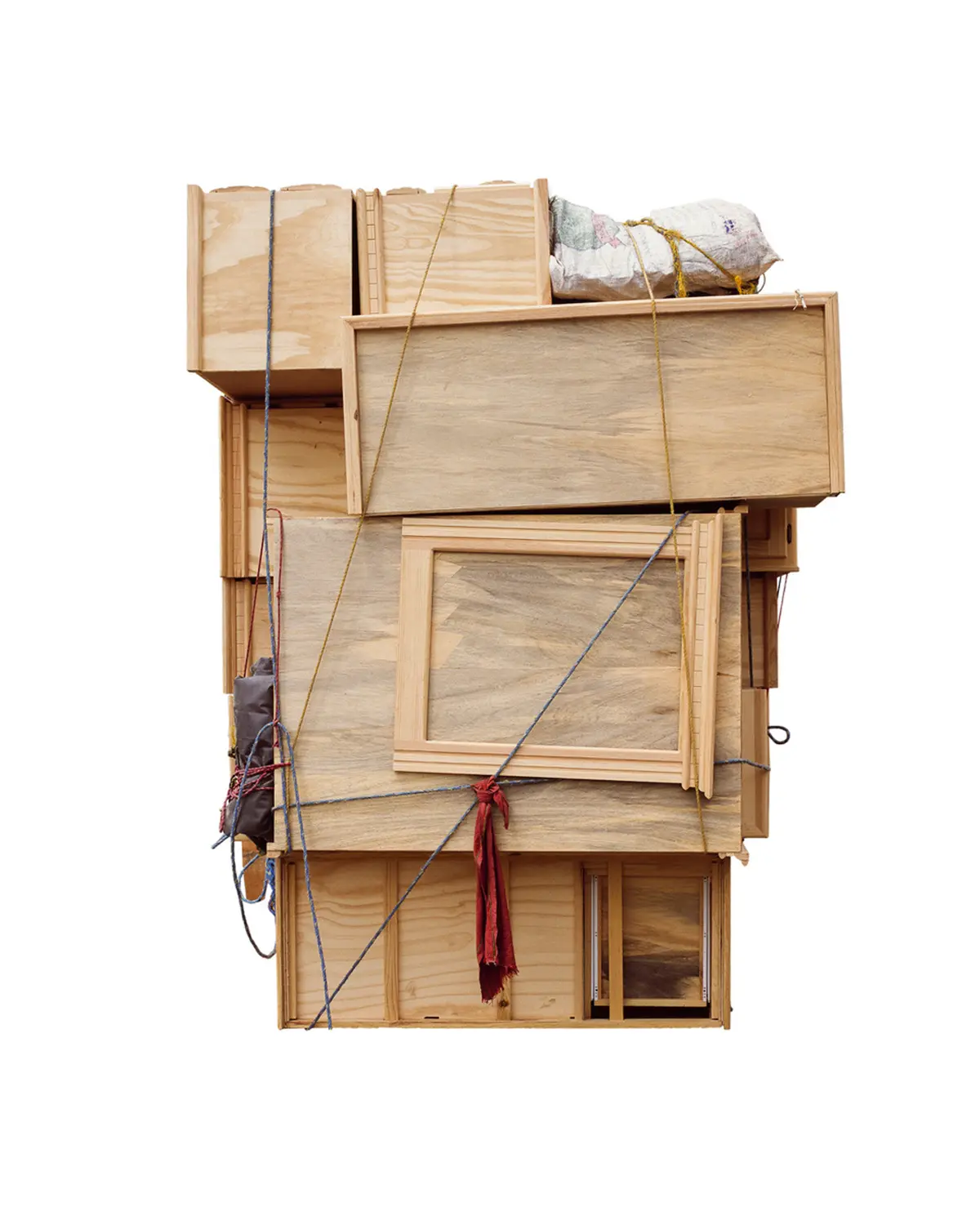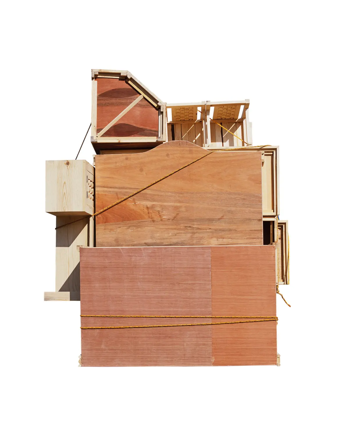Ensamble significa ensamblar o juntar componentes separados. La serie entrelaza fotografías tomadas en un mercado de muebles en las afueras de la Ciudad de México. El punto de partida de la obra es una tipología de fotografías de la parte trasera de camiones llenos de muebles. Cada uno similar, pero sutilmente diferente del otro. Utilizando los muebles de este mercado, procedí a cortar y ensamblar las piezas para crear una serie de esculturas que fotografié en mi estudio. Estas esculturas se utilizan posteriormente para hacer los cianotipos, creando un ciclo infinito entre escultura y fotografía, imagen y objeto. El título hace referencia al proceso de desmontaje y montaje que implica la creación de los muebles y las obras escultóricas, así como de los fotogramas de cianotipo.