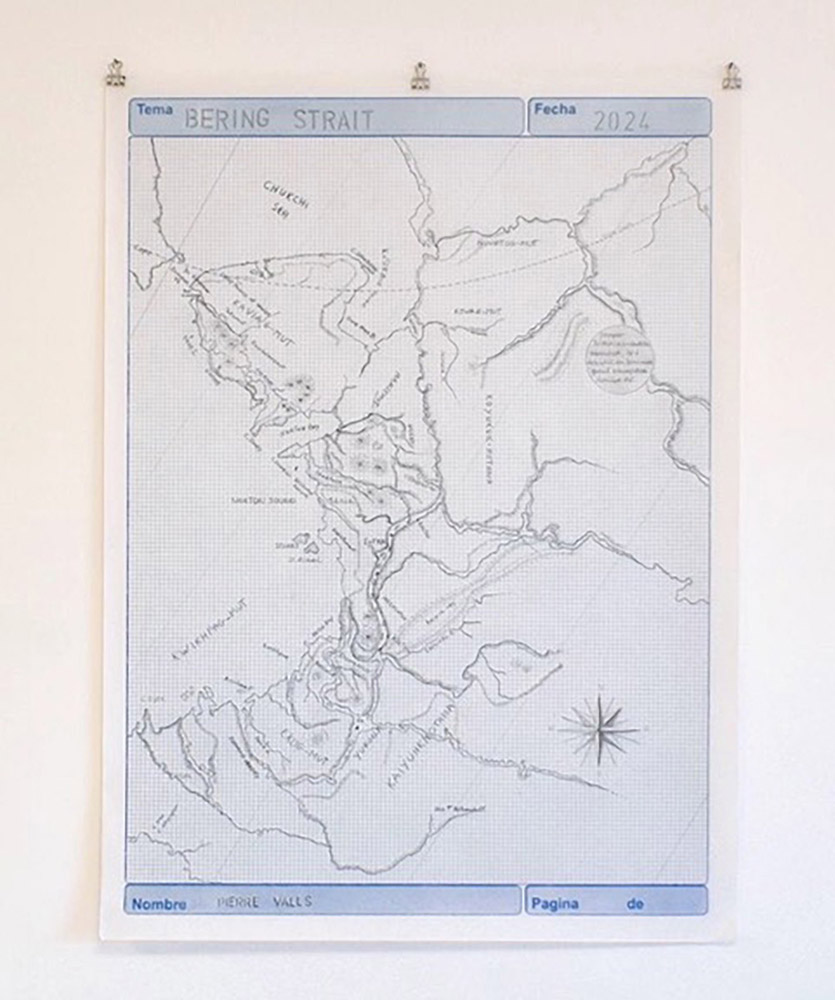 Dulce emulates Sebastian Münster’s map. Die Nüw Welt (The New Islands), circa 1544. In it it is observed for the first time within the cartography that mentions “America”. In it the congregation of European languages is observed: Italian, Latin and German, which implies the participation of different «experts» in its elaboration, this in turn graphically describes the expedition of Magellan, who died in the Philippines before return to Europe. The above data allow us to explain the particularity of the map, which according to assumptions was made through the narratives of the aforementioned expedition. It emphasizes what we could now call South America given the proximity that the expedition had to the southern lands, which slightly affects the coincidence of its cartography, the rest presents notable inconsistencies due to the lack of knowledge of the territories. In a place in that far south you can read “cannibals”, a perception or myth that would trigger in advance the stereotyping of the “savagery” of the native peoples.The relationship between this work and Dulce Chacón’s work in general with that carried out by Pierre Valls in Diomedes is important. Maps, the product of expeditions, commissions and trips, are still considered the true portrait of the territory, in some cases they are even state secrets, while they are used as evidentiary material in territorial disputes or maritime delimitations, however, both Research allows us to agree that despite technology, there are many spaces still unexplored, that those hemerographic demarcations vary, are subject to change in this case and in correlation due to the action and inaction of man. Which, like everything else, are results of anthropogenic production, and therefore contain actions and experiences in them. In Dulce’s words, “the world continues to open like a book,” Pierre has managed to capture the process of experience in his journey to build a cartography, perhaps not geographical, but his own, as a social animal, exposing his body and his vulnerability as a living being.