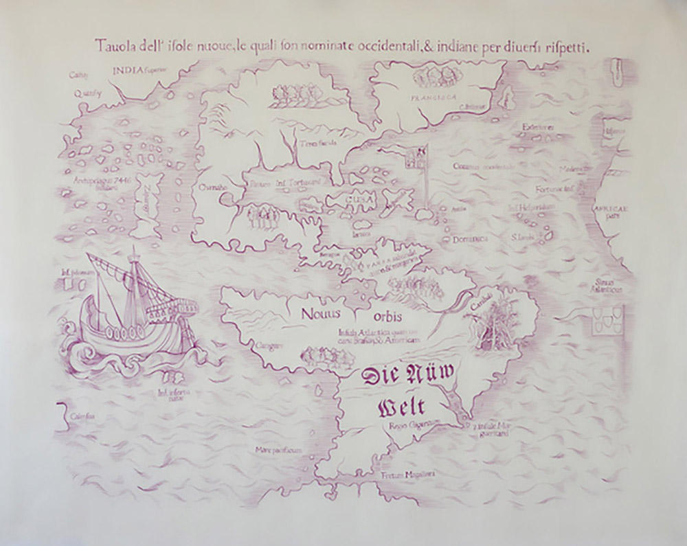Dulce emula el mapa de Sebastian Münster. Die Nüw Welt (Las nuevas islas), circa 1544. En el se observa por primera vez dentro de la cartografía que hace mención a “América”. En el se observa la congregación de lenguas europeas: italiano, latin y alemán, lo que in ere la participación de diferentes “expertos” en su elaboración, este a su vez describe gráficamente en la expedición de Magallanes, quien fallece en Filipinas antes de retornar a Europa. Los anteriores datos permiten dar razón de la particularidad del mapa, el cuál según supuestos fue elaborado a través de las narraciones de la mencionada expedición. Enfatiza en lo que ahora podríamos denominar Sudamerica dada la proximidad que tuvo el expedicionario a las tierras del sur, lo que in ere ligeramente en la coincidencia de su cartografía, el resto presenta inconsistencias notables a razón del desconocimiento de los territorios. En un lugar de ese lejano sur se puede leer “caníbales”, una percepción u mito que detonaría anticipadamente la estereotipación del “salvajismo” de los pueblos originarios. Es importante la relación de esta obra y del trabajo en general de Dulce Chacón con el realizado por Pierre Valls en Diomedes. Los mapas producto de expediciones, comisiones y viajes, aún son considerados el retrato veraz del territorio, en algunos de los casos son incluso secretos de Estado, en tanto, son empleados como material probatorio en controversias territoriales o delimitaciones marítimas, más sin embargo, ambas investigaciones nos permiten coincidir en que a pesar de la tecnología, hay muchos espacios aún sin explorar, que aquellas demarcaciones hemerográficas varian, son sujeto de cambios en este caso y en correlación por la acción e inacción del hombre. Que como todo son resultados de una producción antropogénica, y por ende contienen en ellas acciones y experiencias. En palabras de Dulce “el mundo se sigue abriendo como un libro”, Pierre ha logrado capturar en su trayecto el trámite de la experiencia para construir una cartografía, quizás no geográfica, si no propia, como animal social exponiendo para ello su cuerpo y su vulnerabilidad como ser vivo.