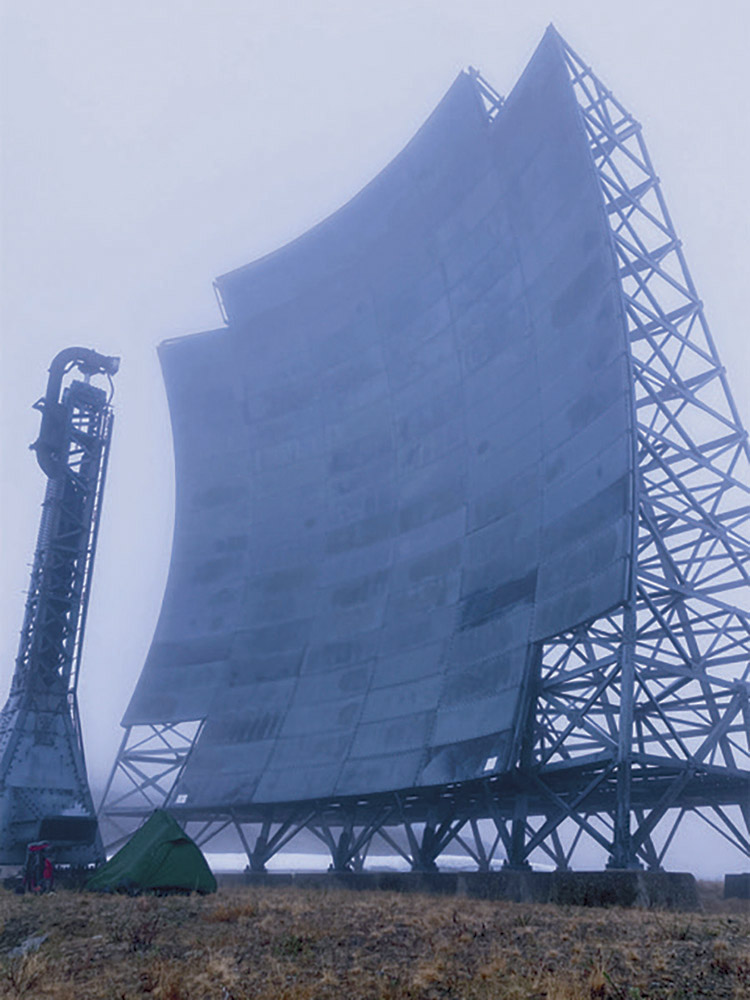 Fotografía realizada en la cumbre de la montaña Anvil –monte sagrado para los Iñupiaq–, allí se divisan los rastros de las estructuras de la White Alice Communications (WACs) system, instaladas por los militares norteamericanos a mediados de 1950. Para obtener esta imagen, Pierre permaneció acampando en la montaña durante una noche, desconociendo la relevancia para los Iñupiaq – dentro de sus creencias nadie puede habitar este territorios–. Las estructuras permanecen vulnerando ahí la cosmogonía del pueblo Iñupiac, como una invasión de hongos que lamentablemente son resistentes al paso del tiempo, así como el resto de signos del desarrollo que persisten en transgredir sus tierras.