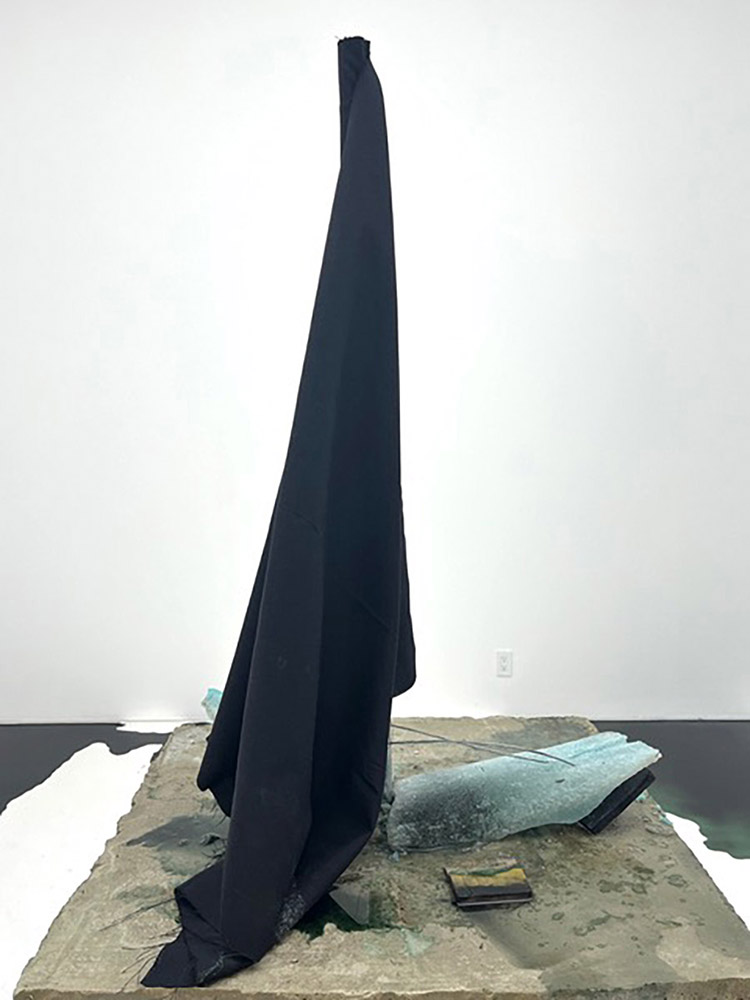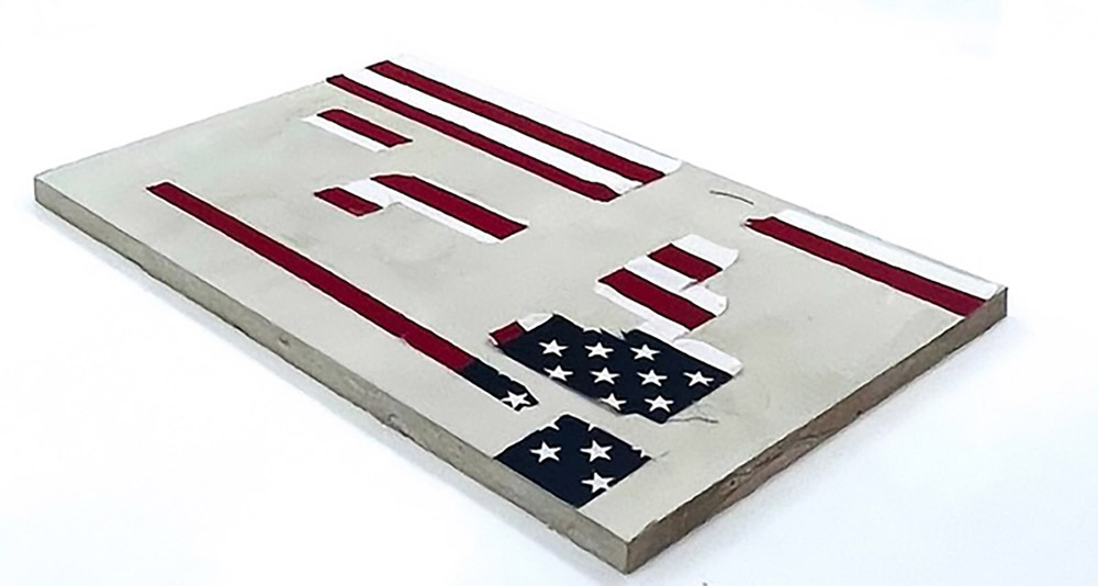 Pierre encontró estos fragmentos en Teller, Bering, Alaska. Estos trozos de bandera que se encontraban dispersos y raídos -algunos ya no dispuestos en esta plancha por su descomposición- en algún momento se ondearon orgullosamente demarcando un territorio del que jamás se ha responsabilizado. El viento le da vida a las banderas y las convierte en un caos, en este caso es un símbolo de la ironía, una imposición identitaria de un país del primer mundo en un territorio que no goza de ninguno de sus bene cios, un lugar olvidado por sus políticas, donde no existe infraestructura ni agua potable.