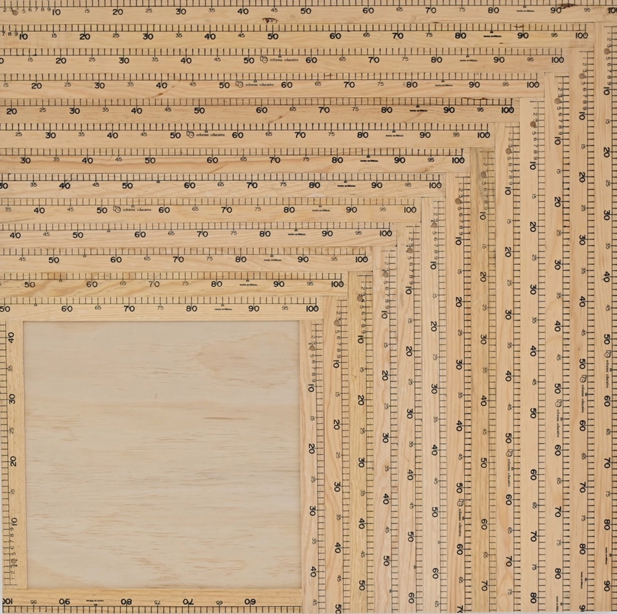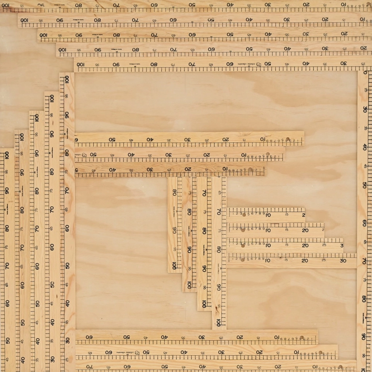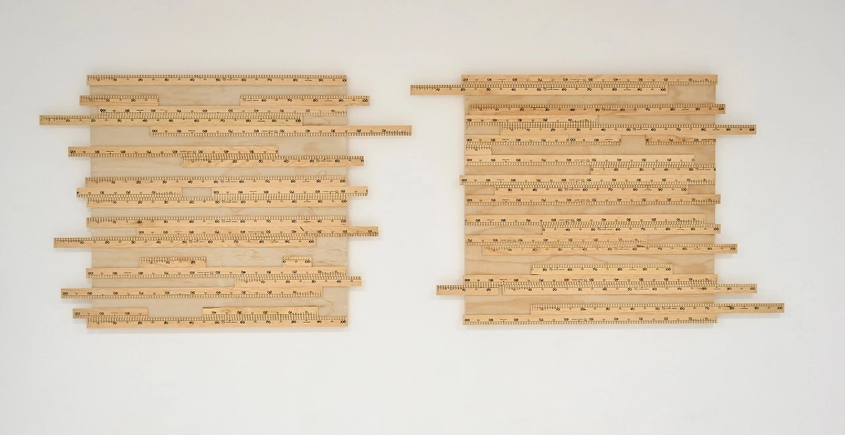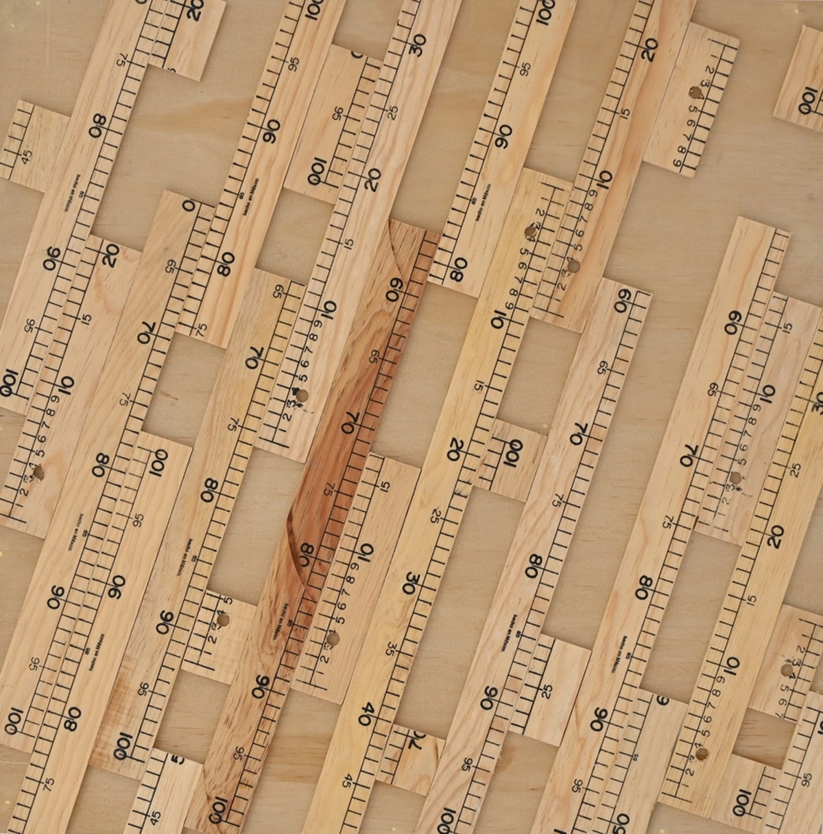 Serie de 10 obras que parte de la regla de 1 metro como instrumento de medición y patrón que es sometido a un proceso de repetición no industrial en el que sufre imprecisiones derivadas a su proceso manual, en donde patrón y objeto de medición ya no es exacto, ni perfecto.