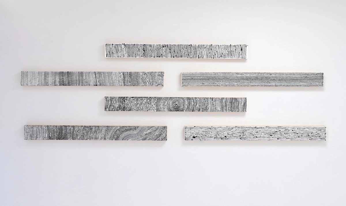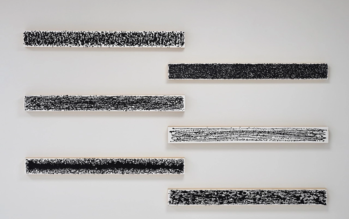 Serie basada en la distancia de 1 metro y el dibujo de este material extendido en líneas que siguen su recorrido de patrón imperfecto a través del recorrido de 1 metro.