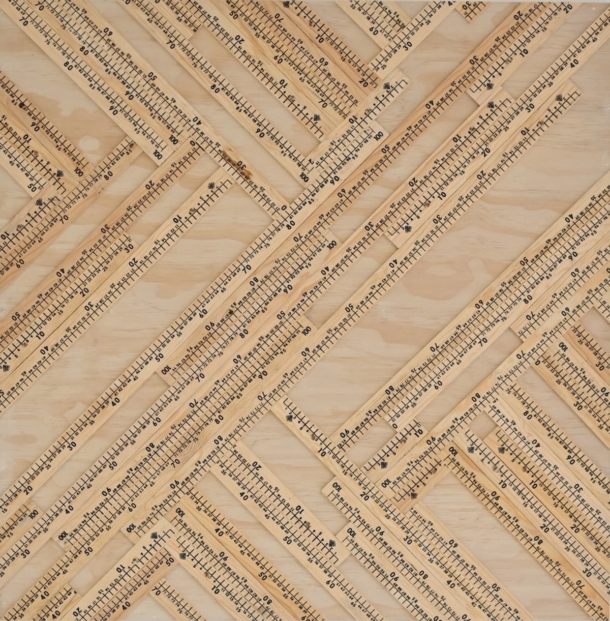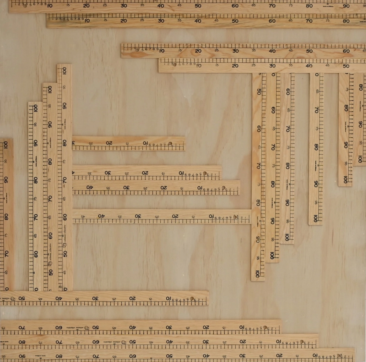 Son ensambles bidimensionales en donde se analizan las posibilidades plásticas al realizar composiciones con cintas métricas, jugando con su materialidad y su imagen simbólica de patrón de representación de distancia.