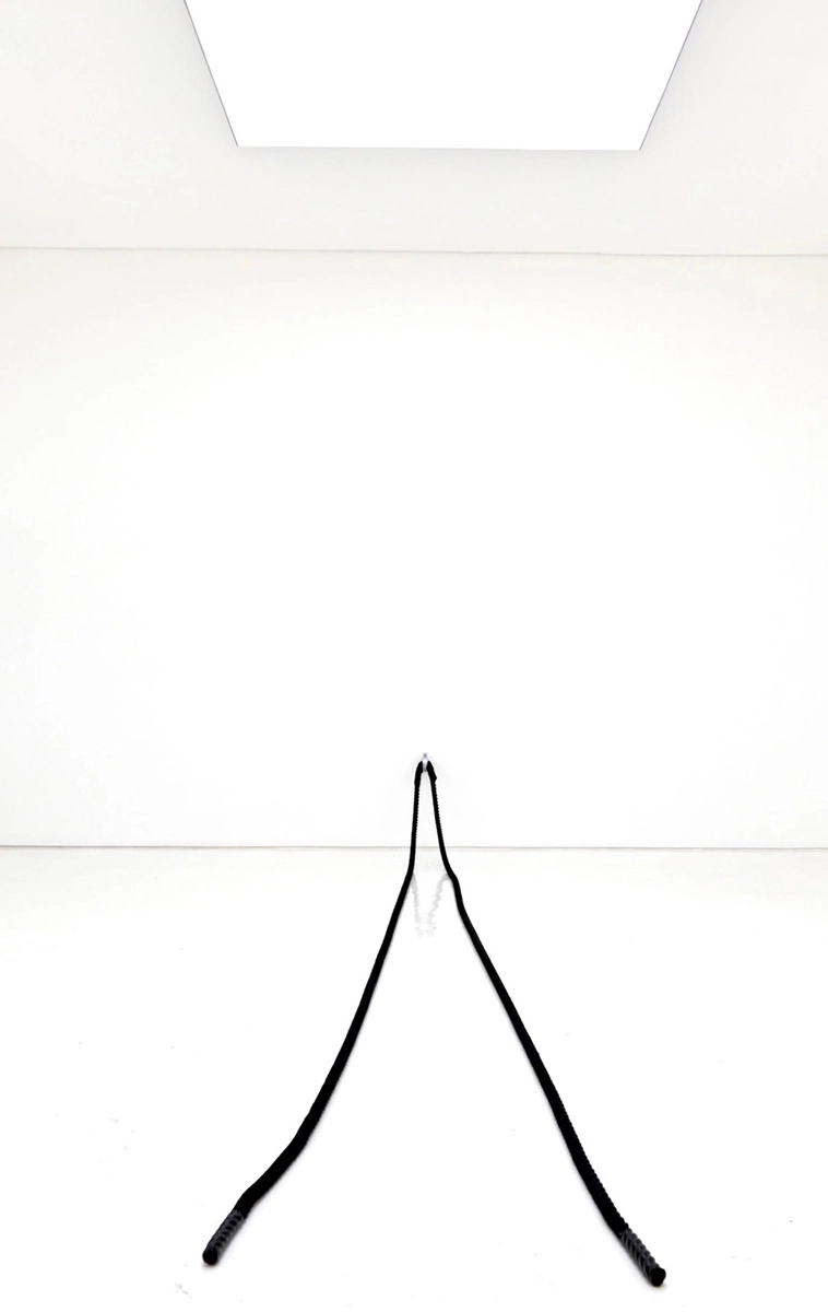 Activación de una cuerda de ondulación (Battle Rope) por el espectador, generando, a partir del movimiento, un dibujo en el espacio. Esta vibración y acción adquiere una dimensión gráfica y poética: el vacío se convierte en campo de energía. El espacio, el cuerpo, el movimiento, la luz y la sombra actúan como un mismo gesto gráfico temporal.