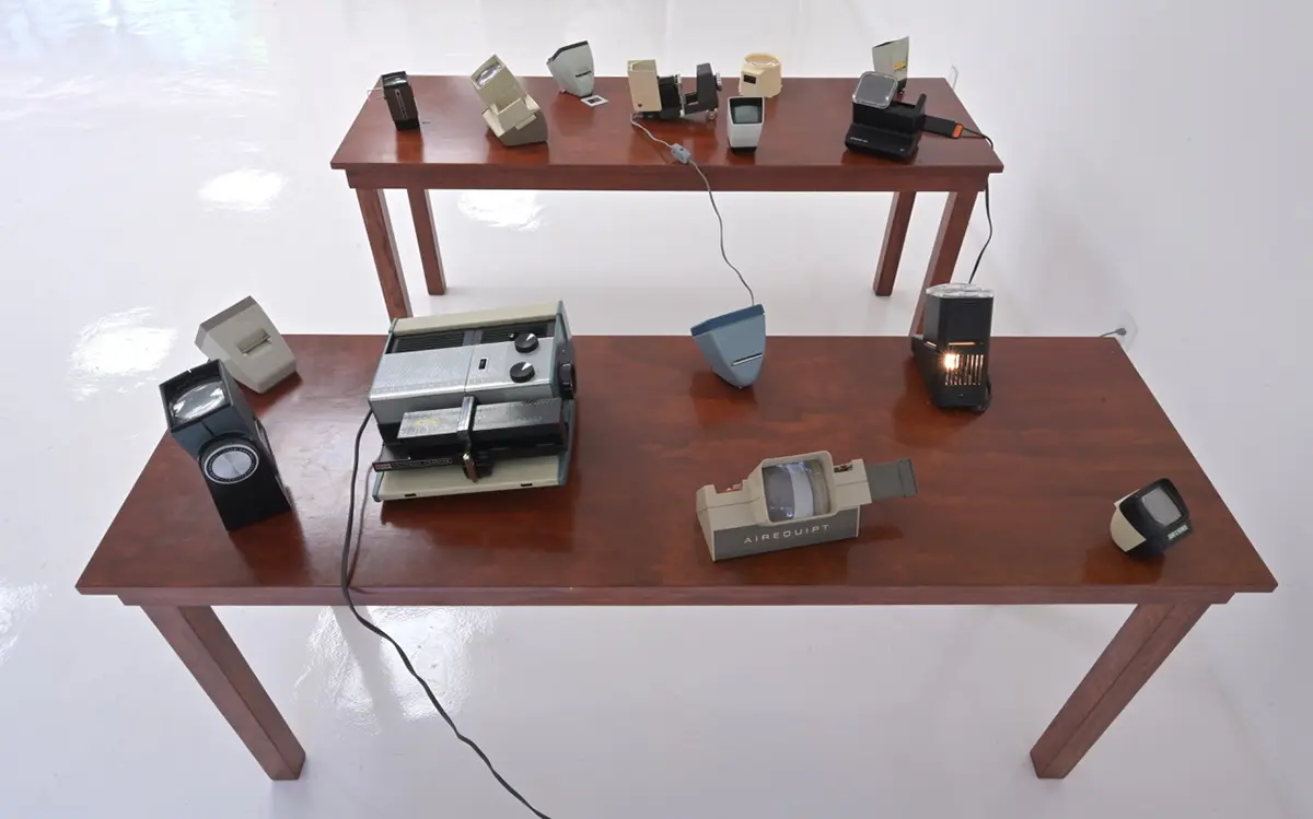 “Zonas de Memoria tiene como precedente Poética del Espacio, obra conformada por distintos fotomontajes creados a partir de fotografías vernáculas en blanco y negro, y excepcionalmente a color, que presenté en la galería Le Laboratoire como parte de mi exposición Taxonomías Isomórficas en febrero de 2020. Esta obra trata, como la anterior, de la apropiación de imágenes fotográficas, pero ahora en transparencias a color, y que se presentan con distintos tipos de slide viewers (recuperados en distintos mercados de pulgas), y de dos o más proyectores de transparencias antiguos. Las imágenes entonces dependen de los dispositivos para poder ser vistas. Los slide viewers son para mí la recreación del siglo XX de la linterna mágica, en cuanto a la fascinación que existe al observar una fotografía dentro de un objeto, y donde el objeto mismo se convierte en una especie de imagen tridimensional. No utilizo solamente transparencias recuperadas del olvido, extraviadas, sino también tomadas por mí en distintos viajes que realicé por distintos países del continente americano, Europa y Asia, entre 1998 y 2006, y guardadas durante años en un cajón, es decir, de alguna manera también un poco perdidas, así como algunas transparencias tomadas por mi padre en los años 50’s y 60’s en distintos países. Los temas de las imágenes son variados, creando un eclecticismo propio de esta instalación, pero todas ellas tienen que ver con mis recuerdos y con evocar algo, a veces nostálgico, perdido, importante, un déjà vu (…).”